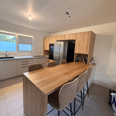 Le chantier comprenait la pose d’une cuisine équipée avec îlot central et la modification complète de l’électricité et de la plomberie pour s’adapter à la nouvelle disposition.
